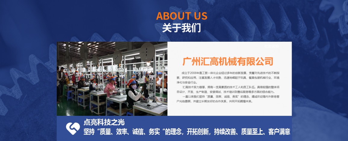 广州汇高机械设备有限公司,成立于2008年是工贸一体化企业经过多年的创新发展,凭着对先进技术的不断探索、研究和应用,注重发展人才优势,迅速地崛起于玩具、餐具包装机械行业,环境净化与安全行业。